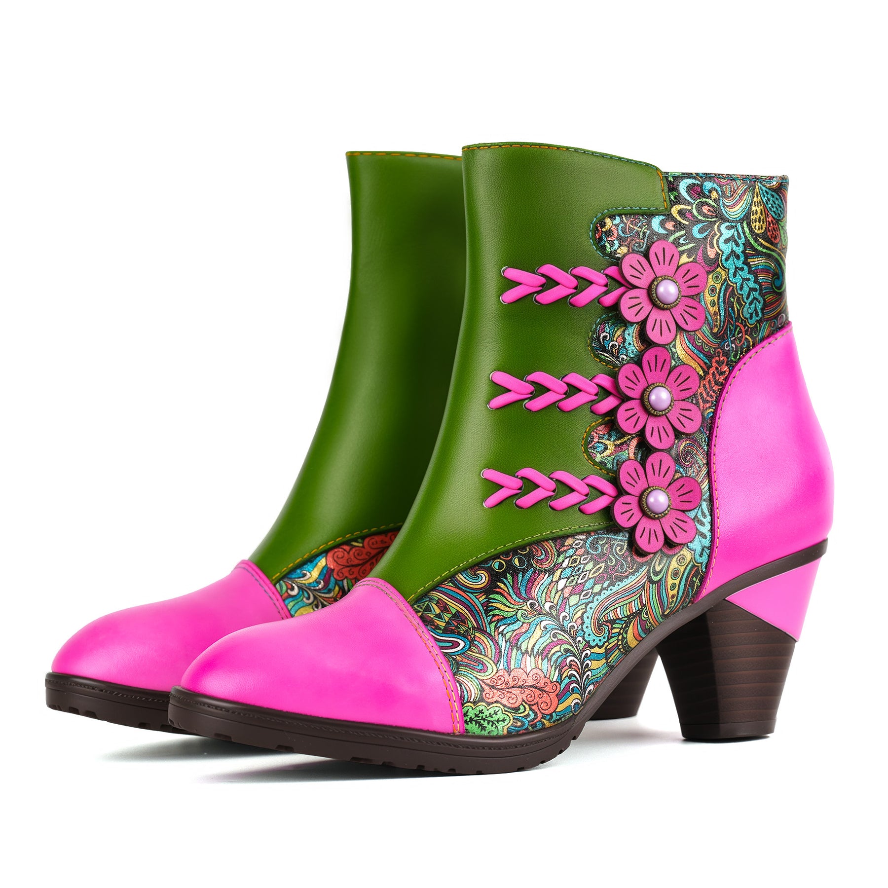 These bold and artistic ankle boots are the perfect blend of style and comfort. Featuring a striking combination of bright pink and green leather, they are adorned with intricate paisley patterns that add a touch of vintage elegance. The floral appliqués provide a playful and feminine accent, making them a unique addition to any outfit.