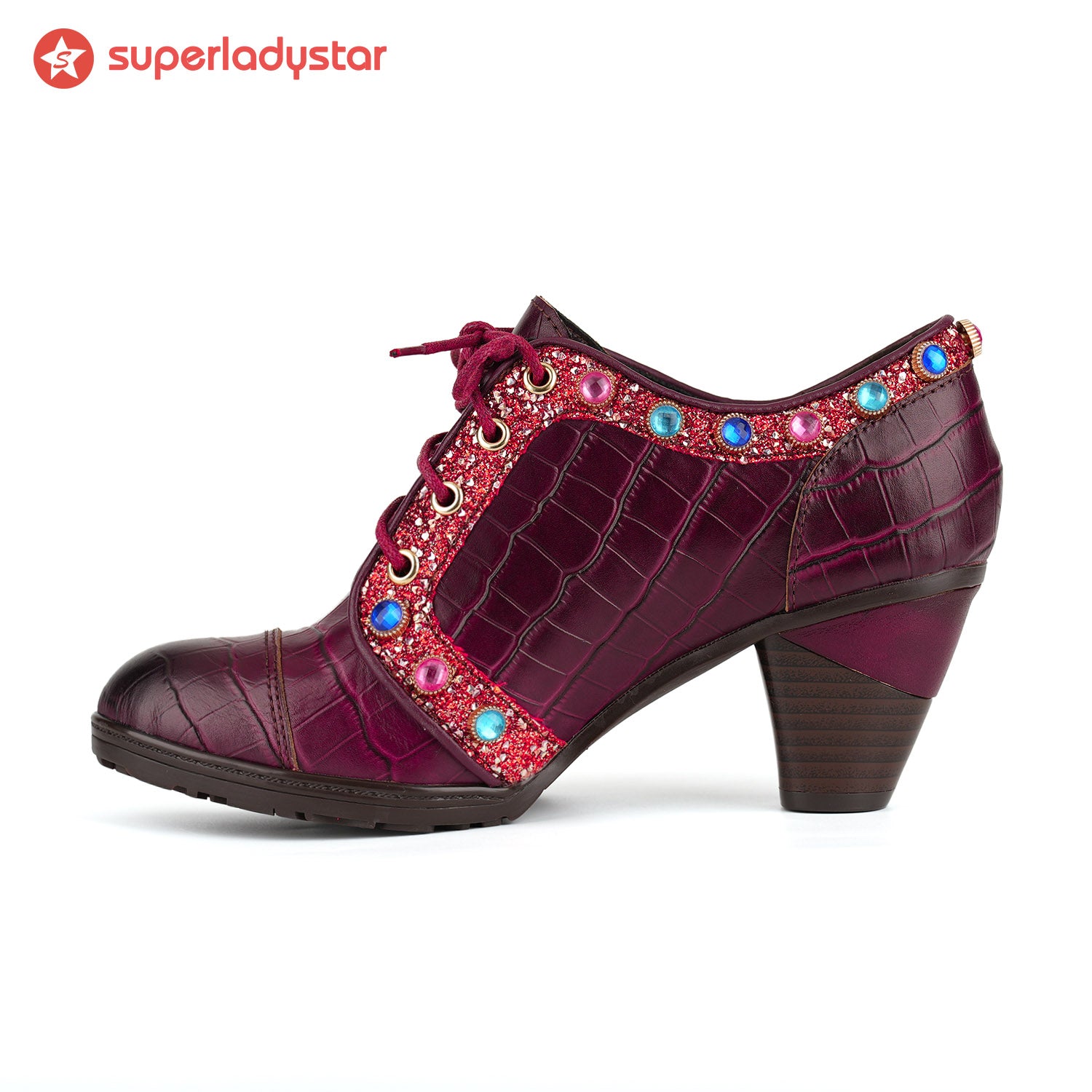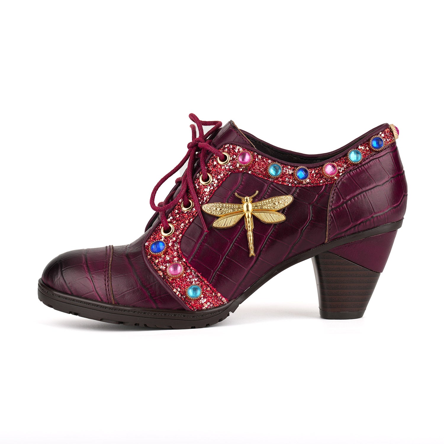 Burgundy embossed leather paired with colorful gemstone embellishments exudes luxurious charm. The metallic dragonfly detail adds a touch of vintage elegance, while the comfortable mid-heel design seamlessly blends sophistication with everyday wear.