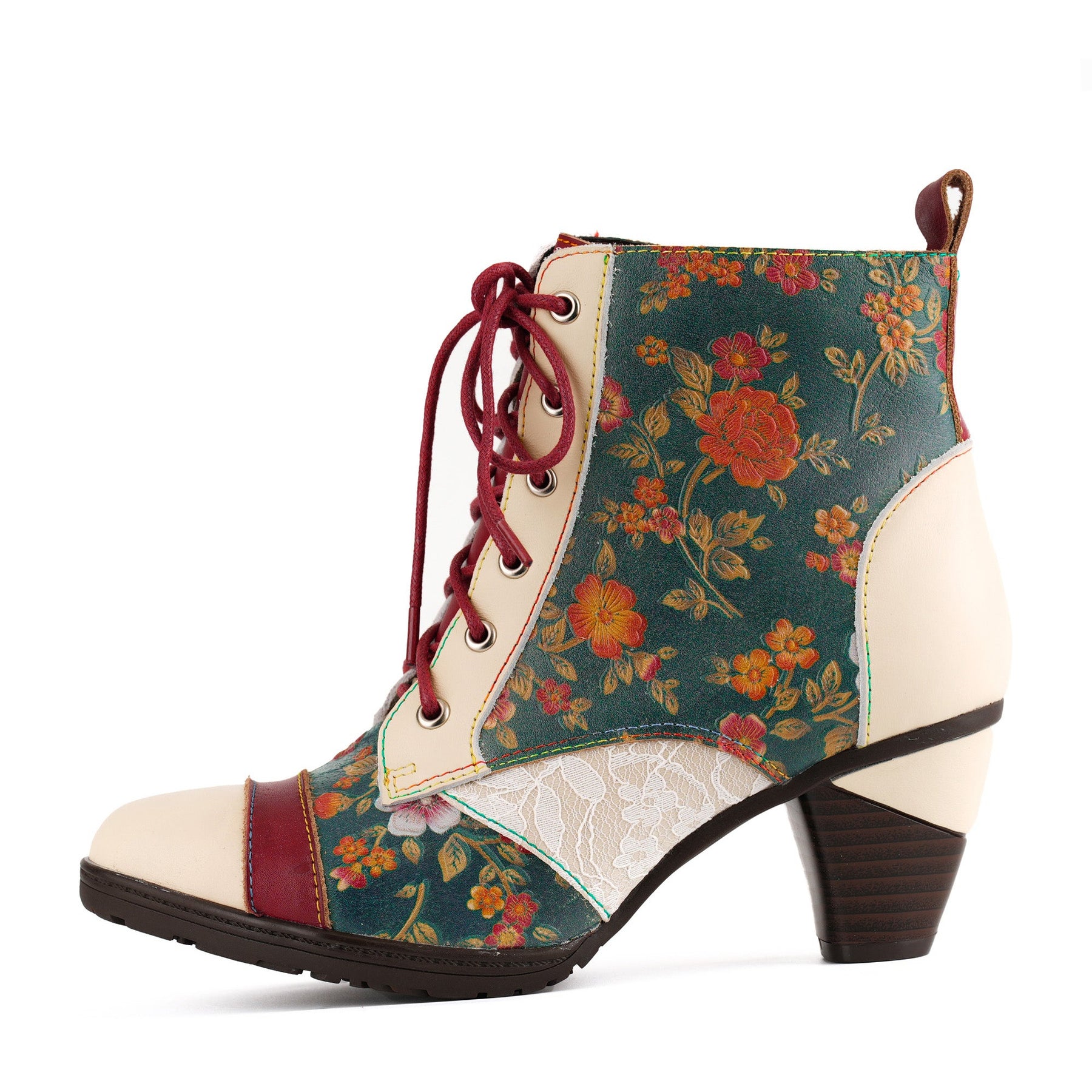 These ankle boots blend the vibrant colors of an autumn garden with a vintage, elegant design. The green leather is adorned with vivid floral patterns, evoking the charm of a blooming countryside and exuding vitality and a natural vibe. The combination of cream and deep red leather creates a balanced color palette, adding a touch of softness and classic appeal. Delicate lace details on the side enhance the boots with a hint of refinement and romance.