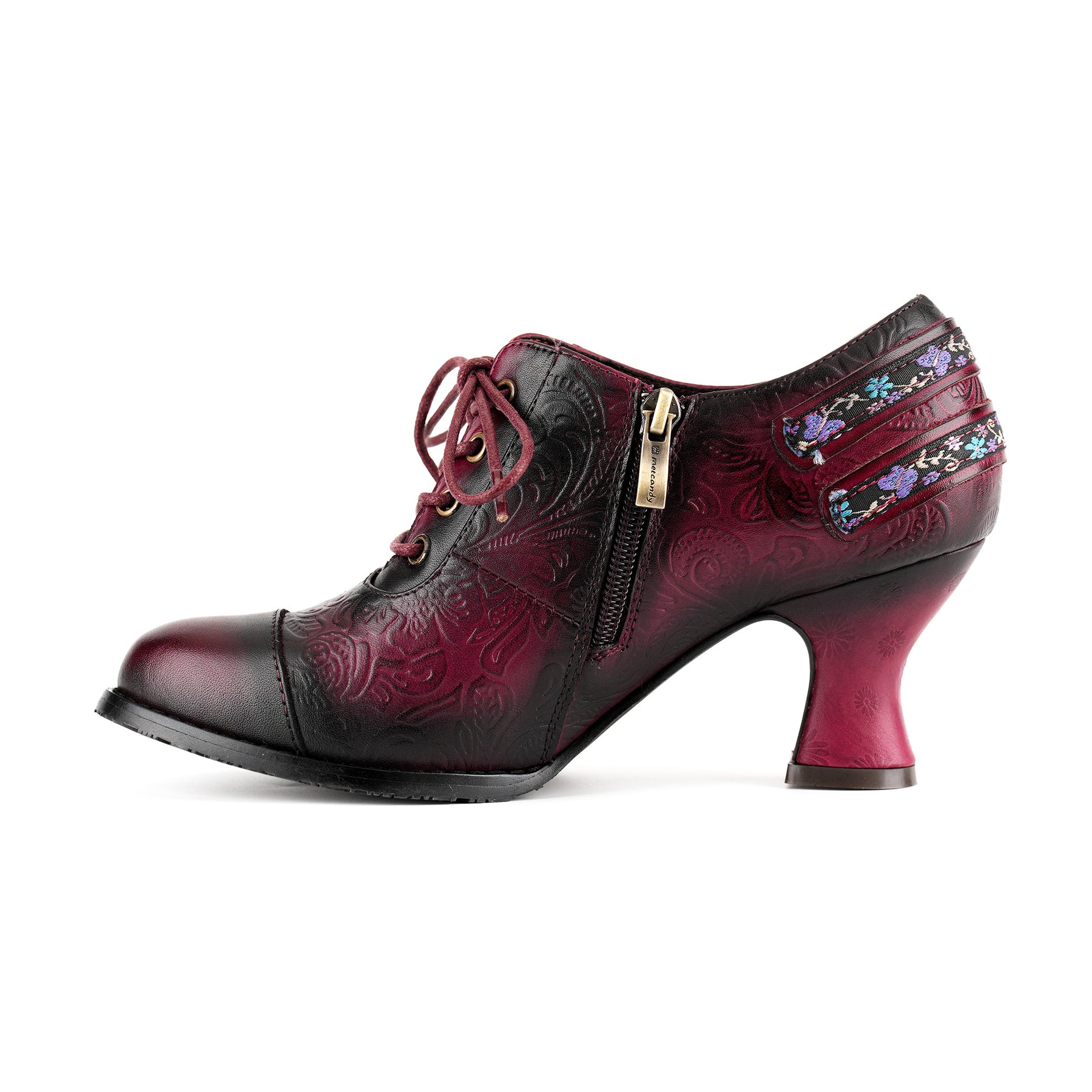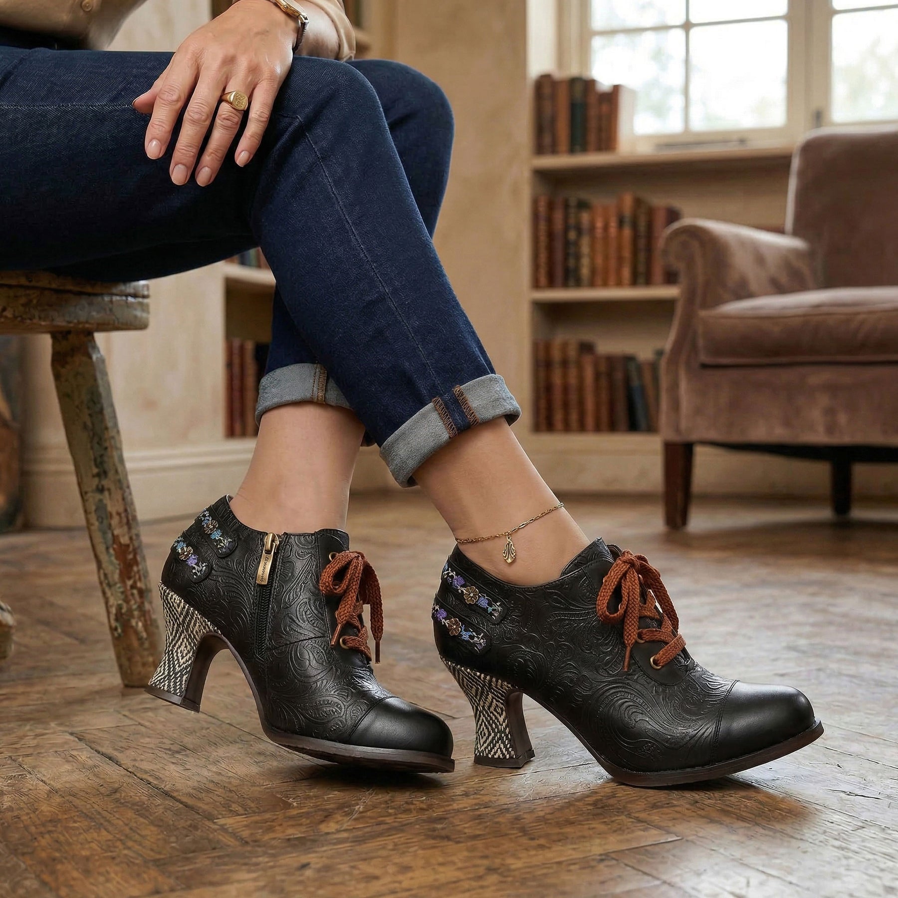 Diese Schnürabsätze mit Blumenprägung vereinen aufwendige Handwerkskunst mit auffälligen Designelementen und machen sie zu einer herausragenden Wahl für stilvolle Frauen. Diese aus hochwertigem Leder gefertigten Schuhe verfügen über zarte Blumenmuster, die auf dem Obermaterial eingeprägt sind, ergänzt durch auffällige goldene Schnürsenkel für einen luxuriösen Touch. Die einzigartigen Absätze mit mehreren Texturen – erhältlich in geometrischen oder gewebten Mustern – sorgen für ein modernes künstlerisches Flair. Diese Absätze eignen sich perfekt für formelle Anlässe oder schicke Freizeitoutfits und bieten gleichermaßen Komfort und Eleganz.