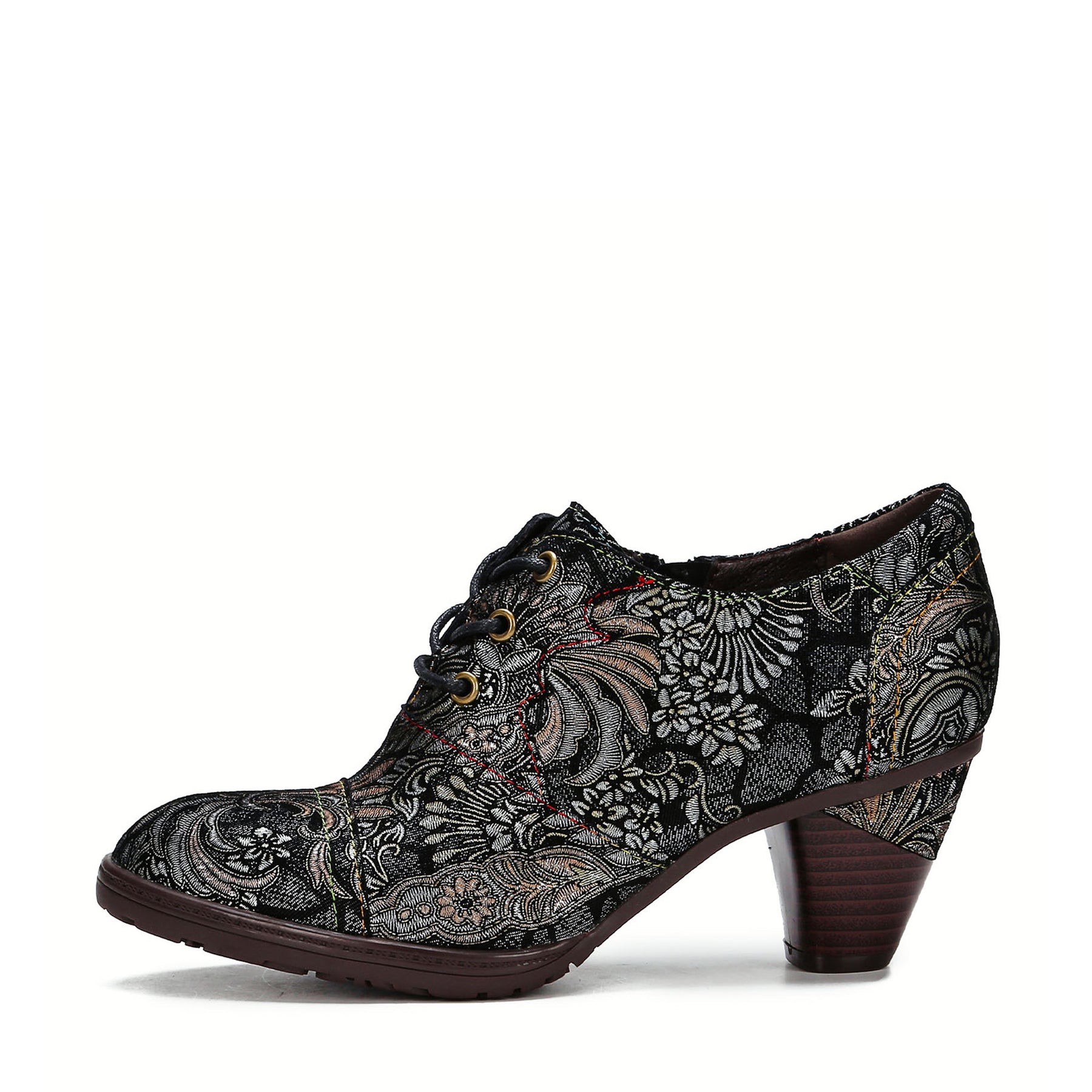 Diese exquisiten Schuhe verfügen über komplizierte und atemberaubende handgedruckte Muster in Silber- und Champagnertönen vor einem dunklen Hintergrund, was einen erstaunlichen Kontrast erzeugt. Die Farben der Fäden tragen zur allgemeinen Schönheit des Designs bei und unterstreichen die Liebe zum Detail und die Handwerkskunst. Darüber hinaus sind diese Schuhe in einer zweiten Farboption mit goldenen Tönen erhältlich, wodurch ein Hauch von Charme und Vielseitigkeit hinzugefügt wird.