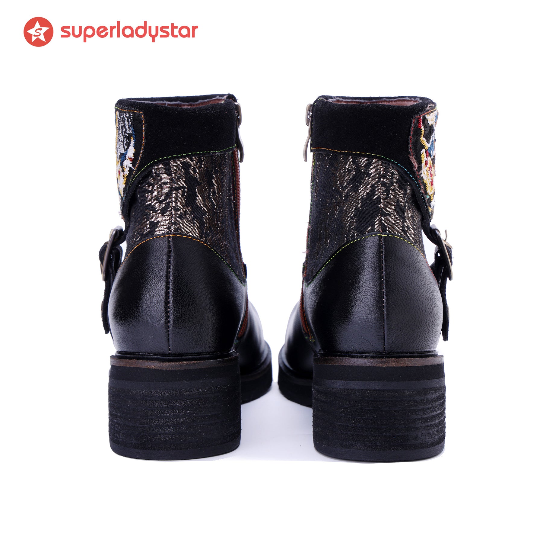 These ankle boots are the epitome of understated elegance, blending classic black leather with intricate floral embroidery and textured fabric details. The embroidered cuff adds a touch of artistry, while the gold-tone buckle accent enhances the stylish design. With a sturdy low block heel, these boots are as comfortable as they are fashionable. Perfect for casual outings, formal gatherings, or adding a refined touch to your everyday wardrobe.