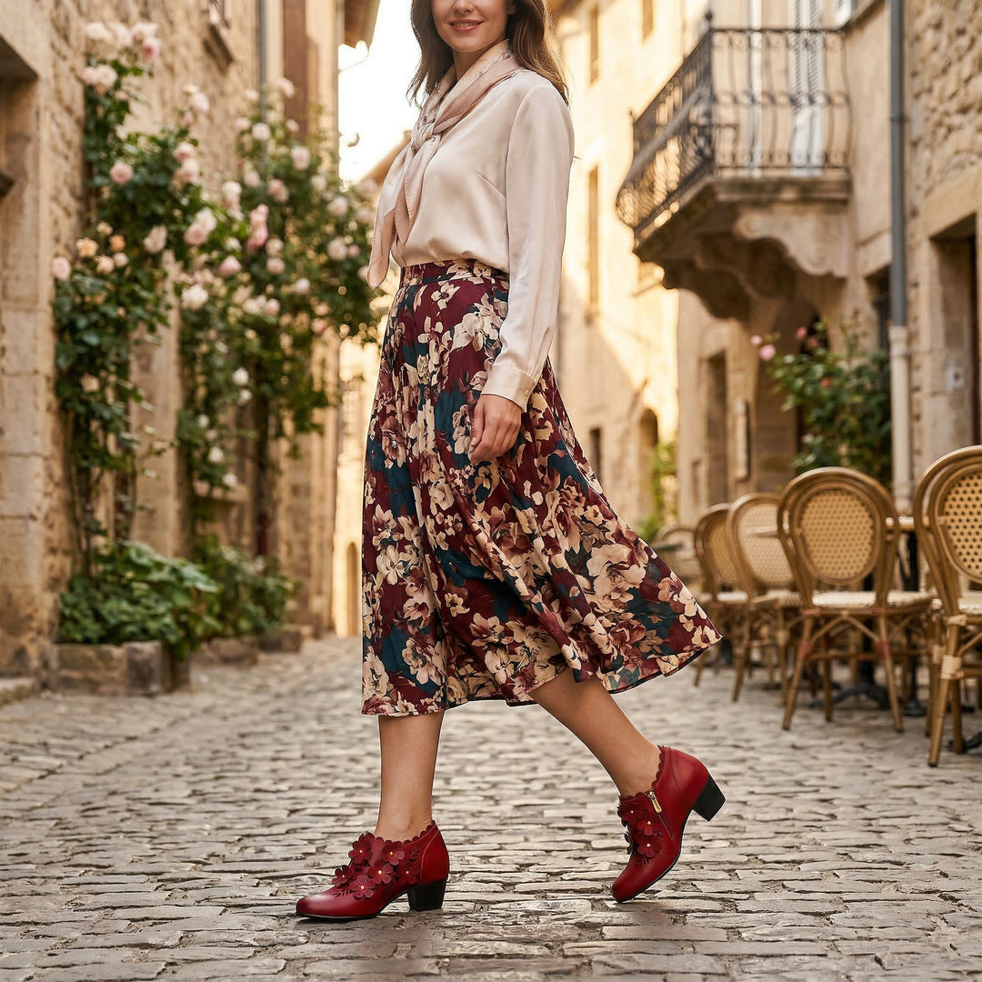 A radiant symphony of vibrant red, adorned with intricately sculpted floral details. These shoes bloom with elegance, making every stride a statement of artistic beauty.