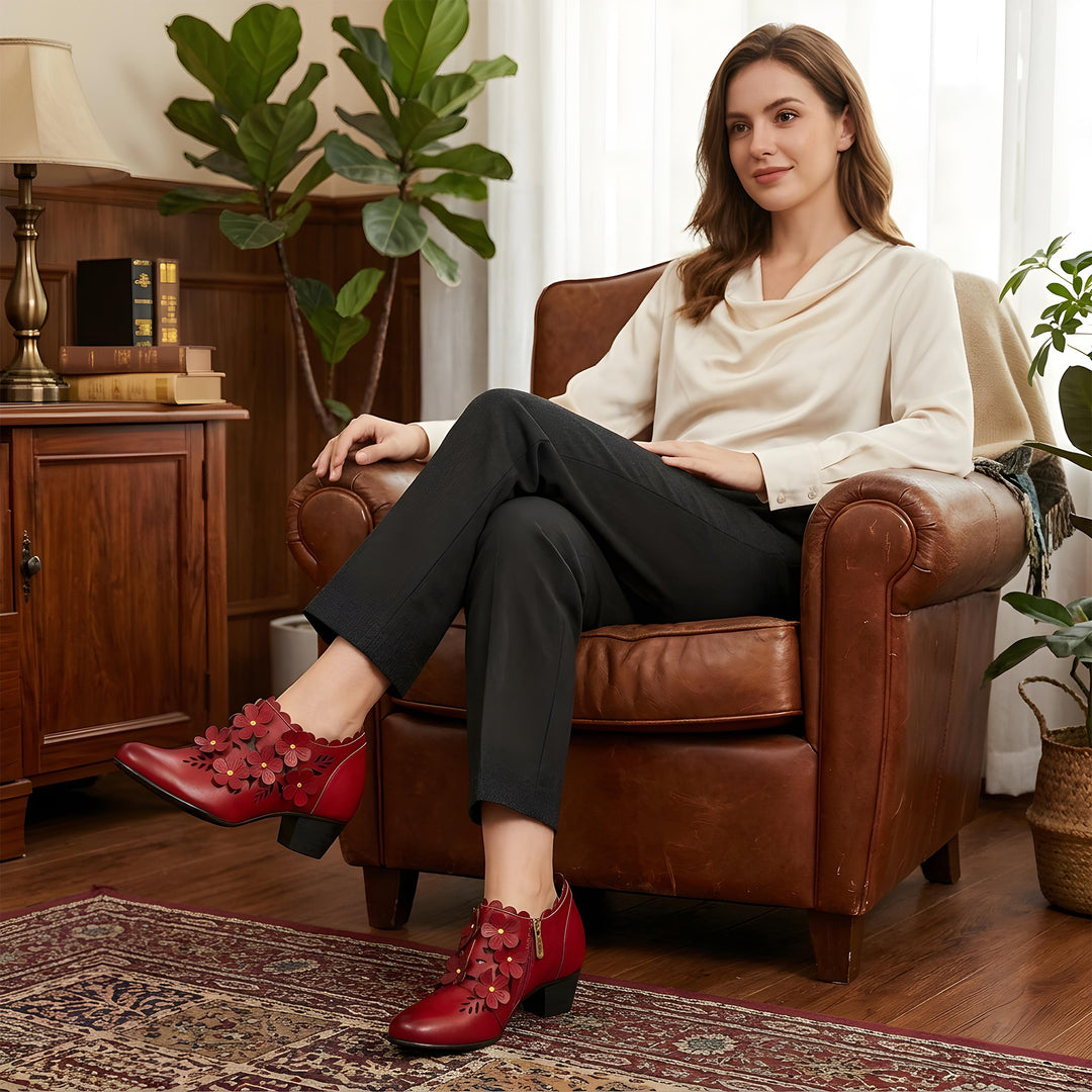 Elevate your style with these leather wonders. Designed not just for comfort, but to captivate attention with their sculptural floral accents and timeless allure.