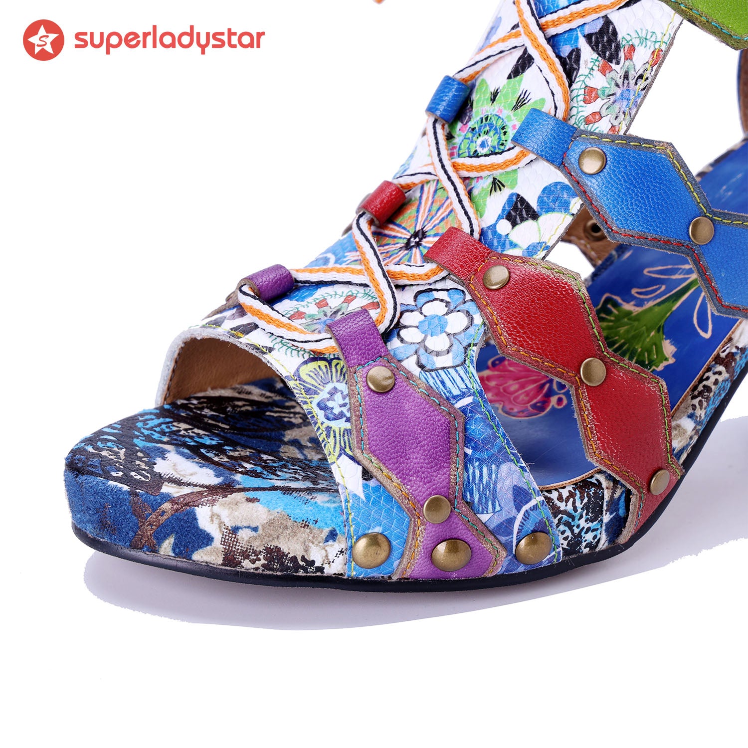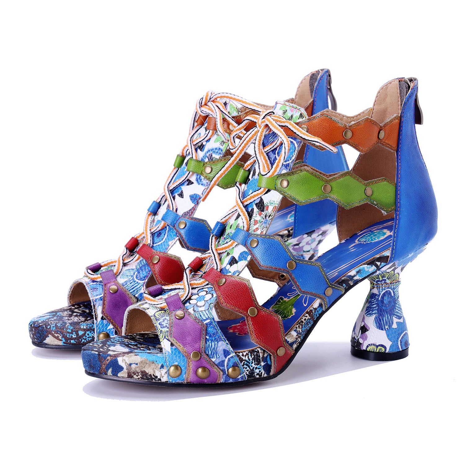 Un patchwork dynamique de couleurs et de textures, amélioré par des détails à lacets ludiques et un talon gros. Ces sandales sont une œuvre d'art portable.