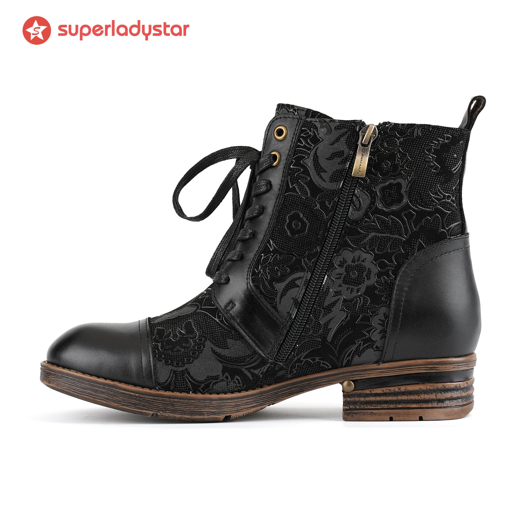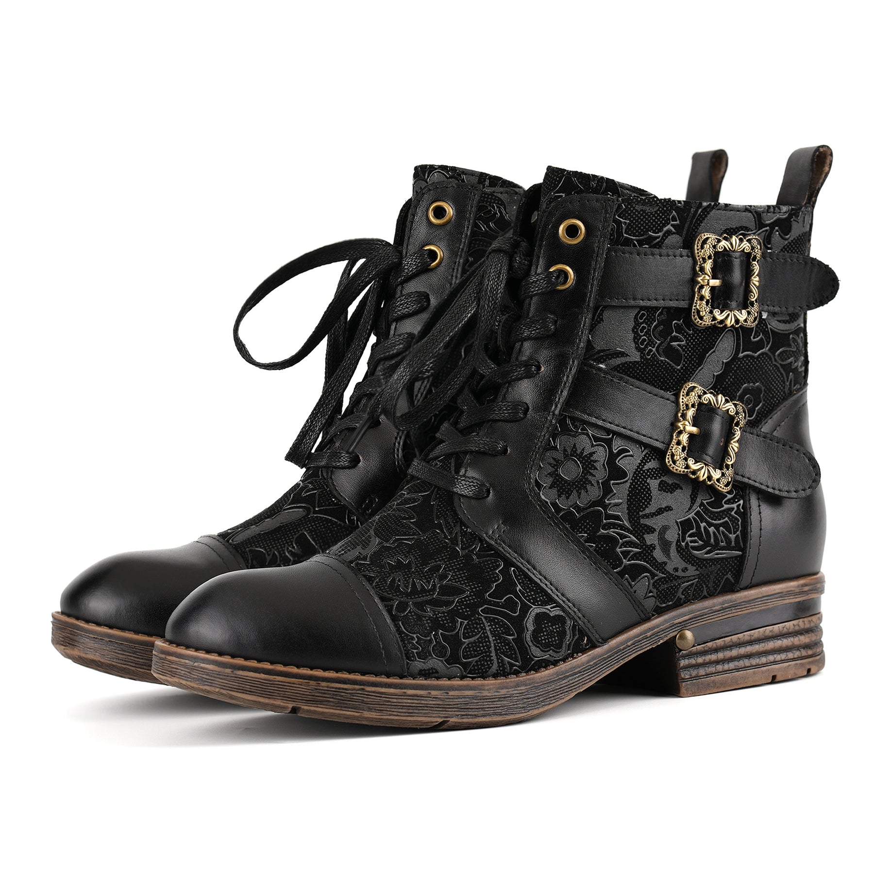 Entrez dans l'élégance intemporelle avec ces bottines présentant des motifs floraux complexes, un design à lacets vintage et une boucle audacieuse. Le talon bloc robuste et le savoir-faire haut de gamme font de ces bottes une combinaison parfaite de style et de confort pour toute occasion.