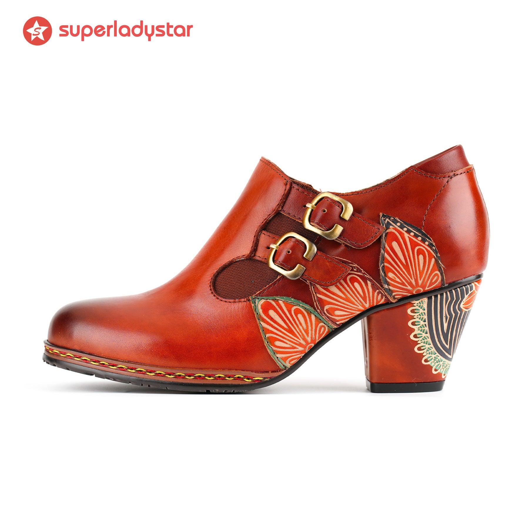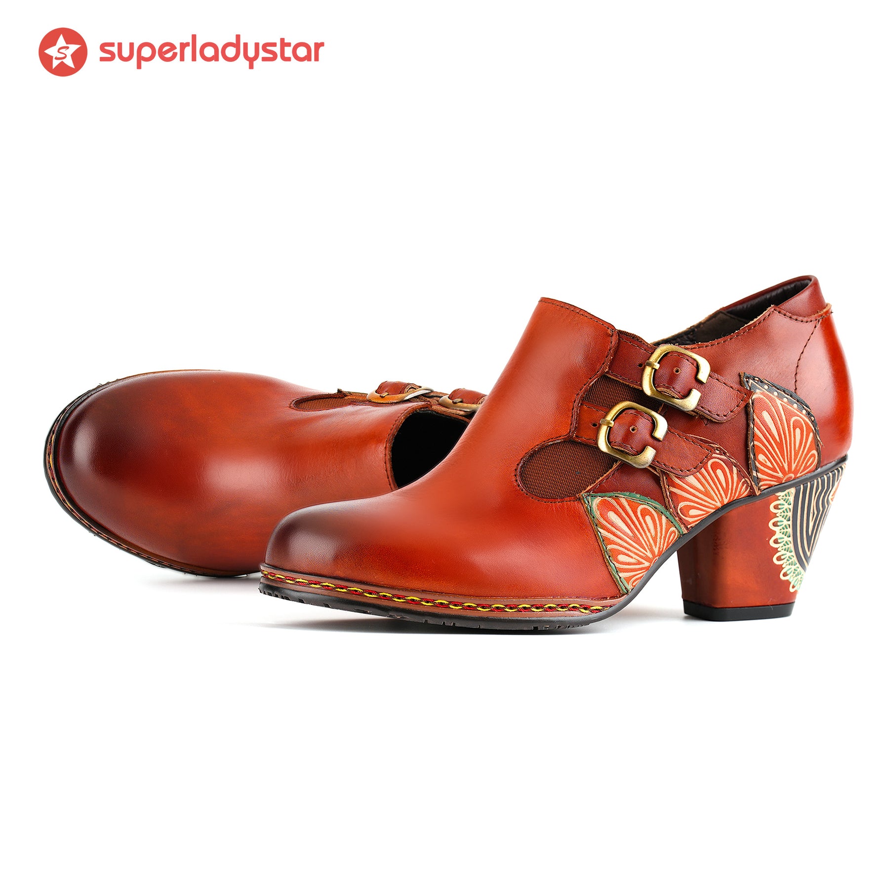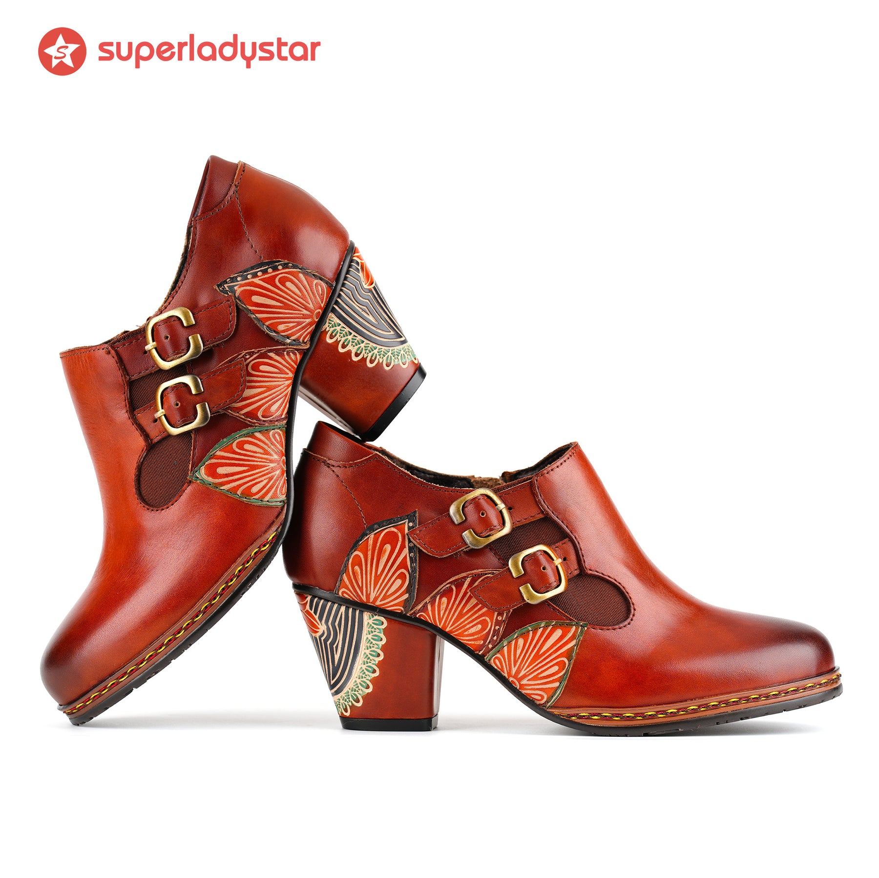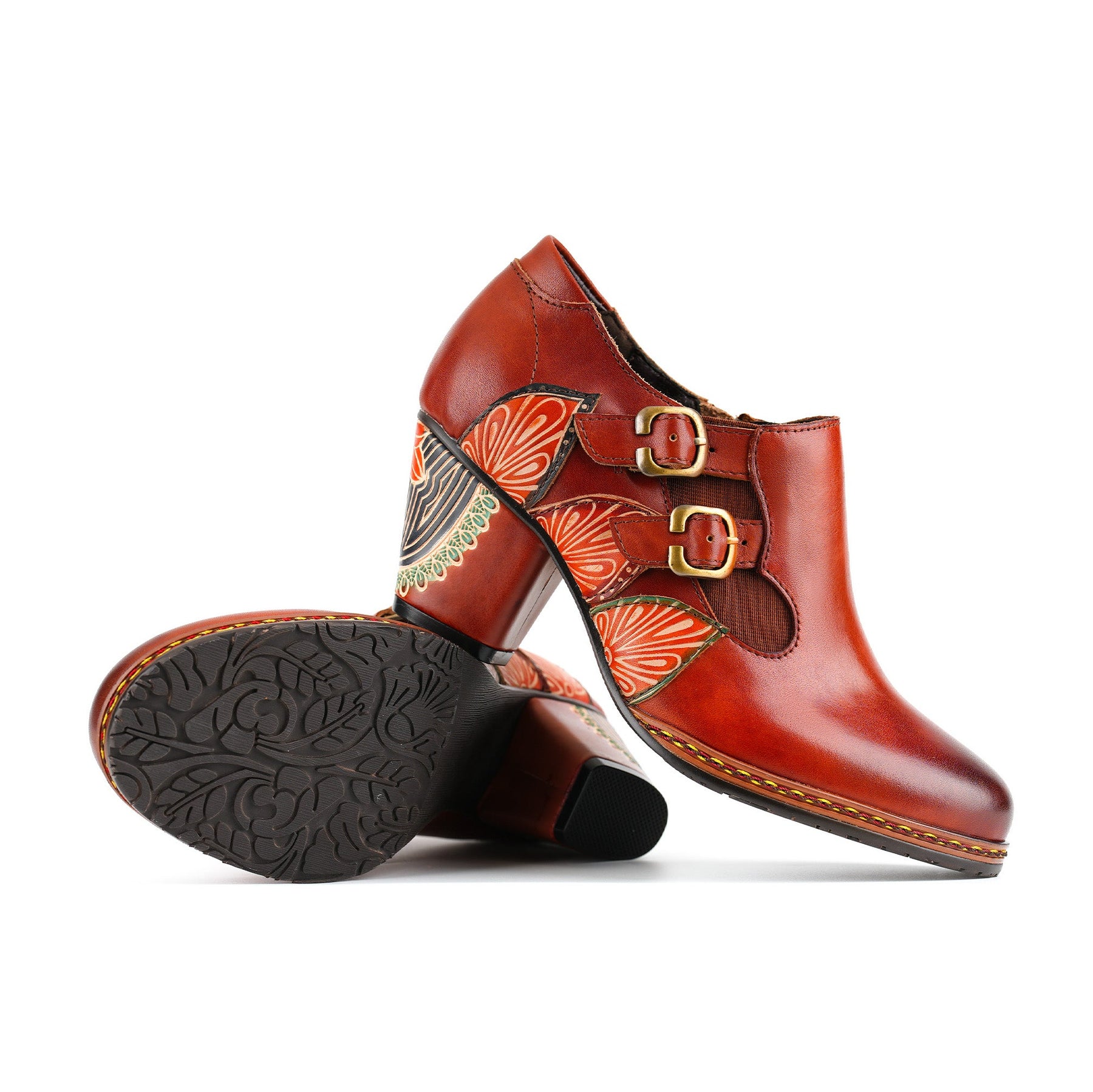 Accendi il tuo stile con una scintilla di arte. Realizzate in pelle ambra infuocata, queste scarpe uniche brillano con motivi floreali dipinti a mano lungo il tallone e scintillanti fibbie in oro. Parti uguali eleganza e originalità, trasformano qualsiasi outfit in una dichiarazione.