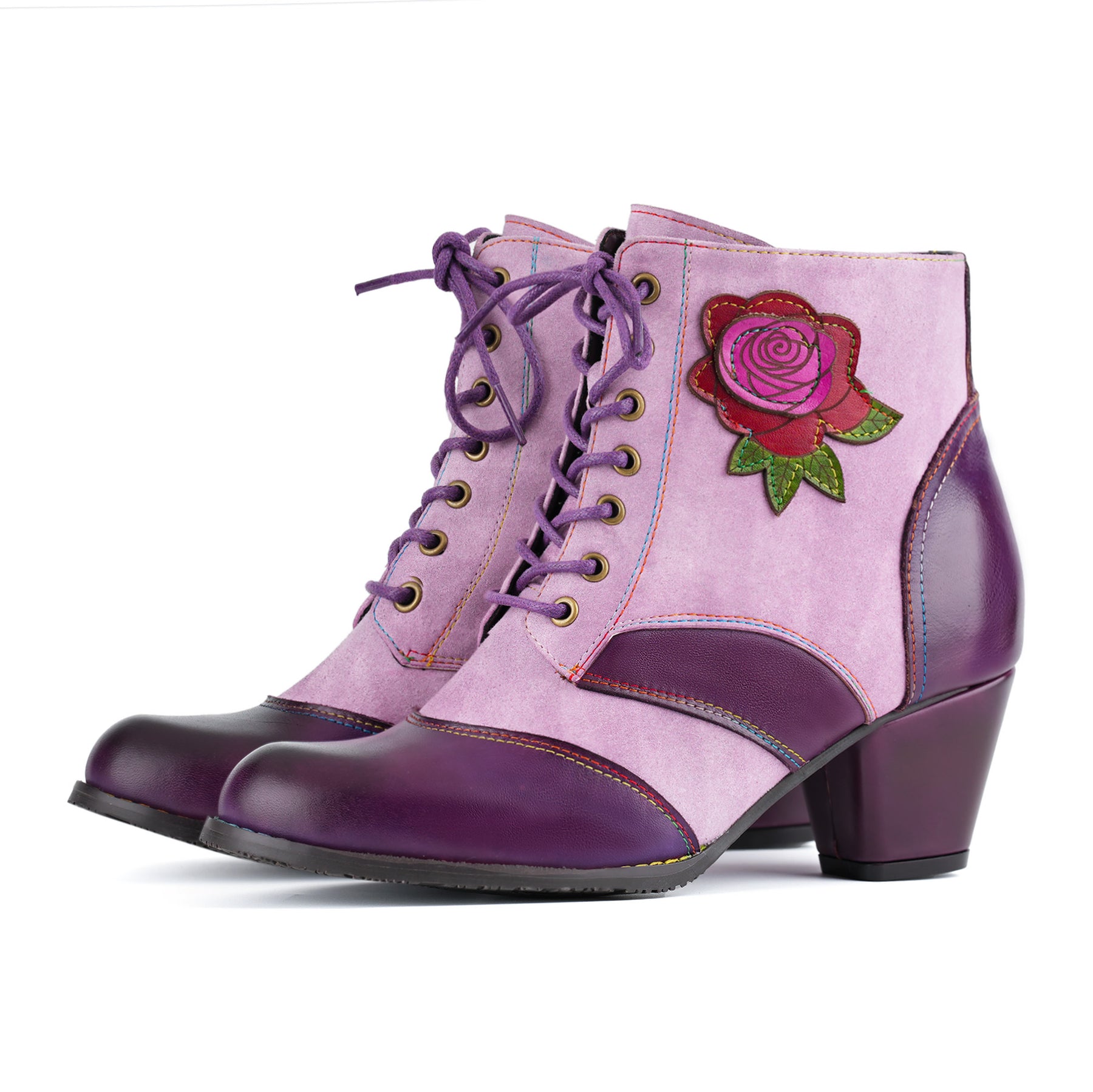 Come una rosa al tramonto, questi stivali catturano sia la forza che la morbidezza. Le tonalità viola e lavanda si intrecciano con un audace ricamo di rose, creando un aspetto che è femminile ma senza paura. Una scarpa per sognatori, artisti e donne che non hanno paura di fiorire a modo loro.
