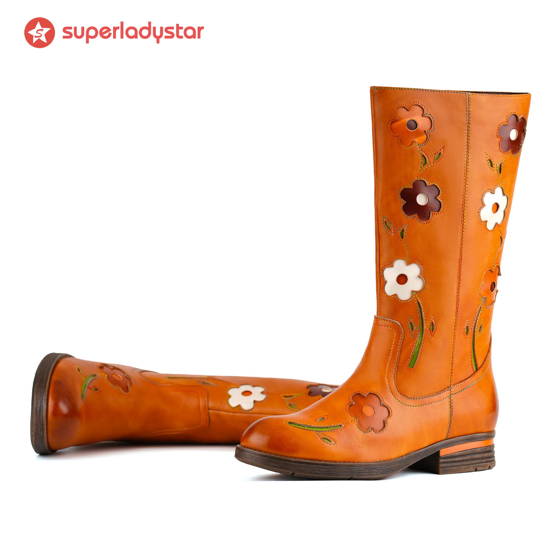 Porta un tocco di fascino vintage al tuo stile quotidiano con questi stivali a medio livello floreale retrò. Realizzati in pelle arancione elastica, sono splendidamente adornati con applicazioni floreali ritagliate e delicate viti ricamate, aggiungendo calore e carattere al tuo look. Il tallone a basso blocco offre comfort e stabilità per tutto il giorno, in modo da poter camminare con facilità e sicurezza.