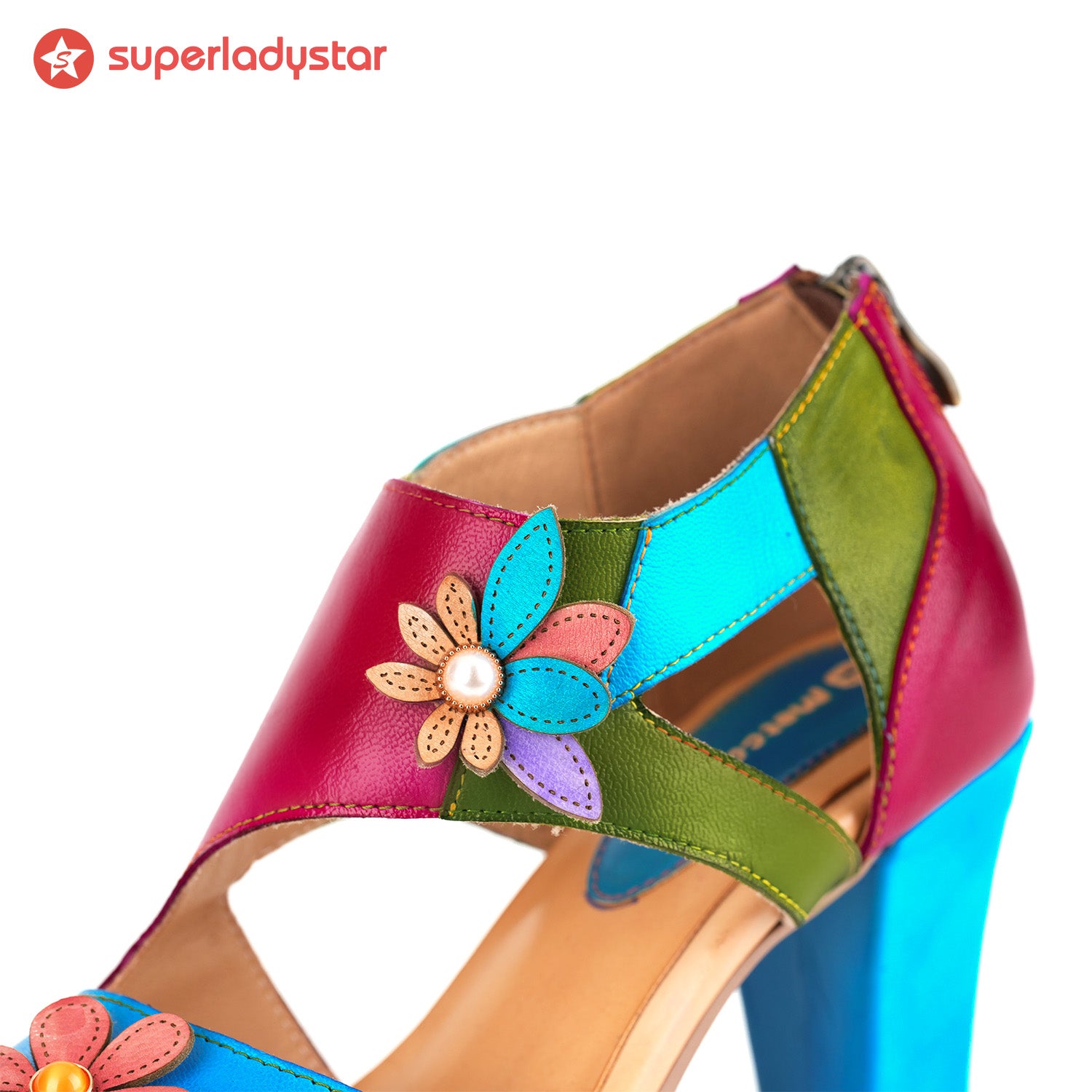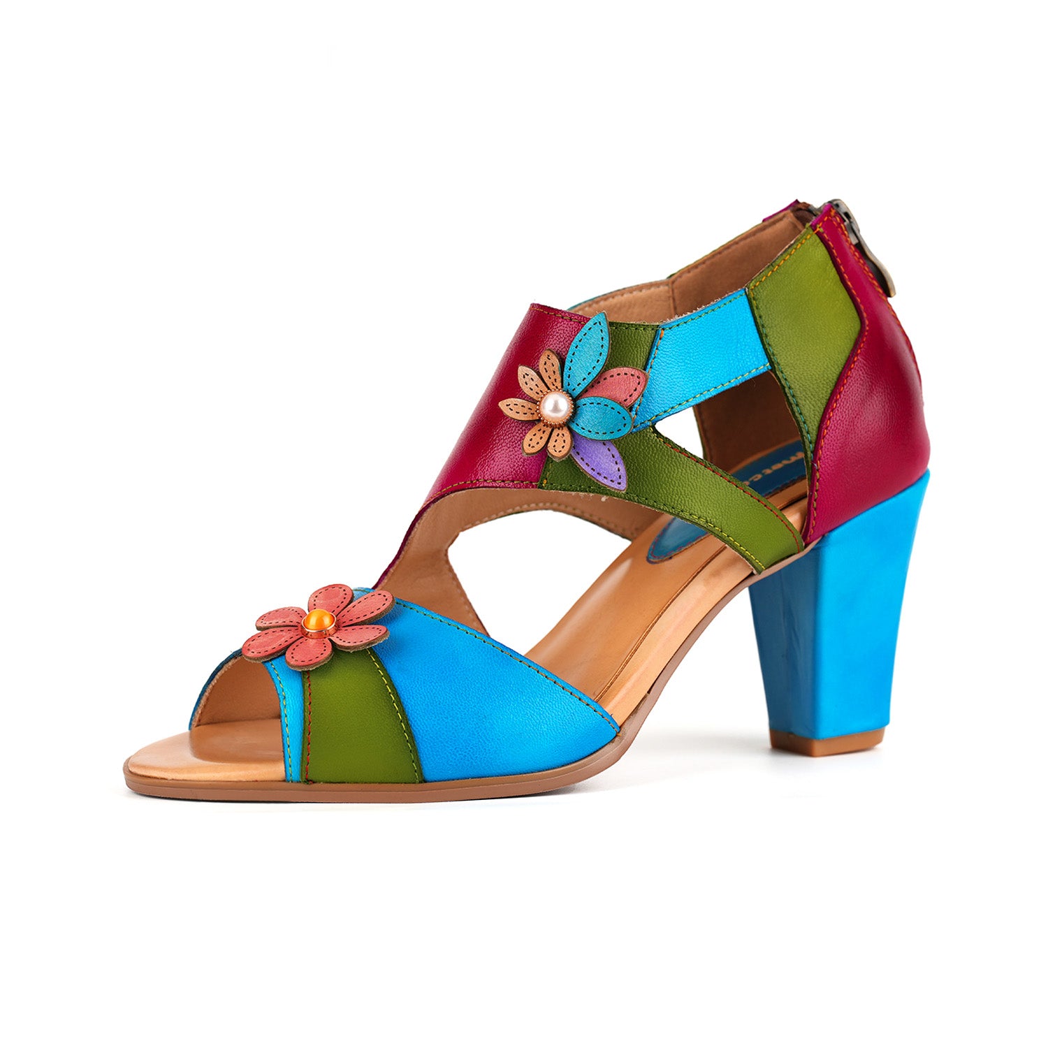 Questi sandali con tacco alto dispongono di un vivace design a colori arcobaleno con toni morbidi di blu, verde, rosa e viola, abbinato a abbellimenti floreali 3D che combinano giocosità e romanticismo. Il design della cinghia incrociata non solo migliora la curva del piede del piede ma anche una dimensione e un tocco chic al look generale.