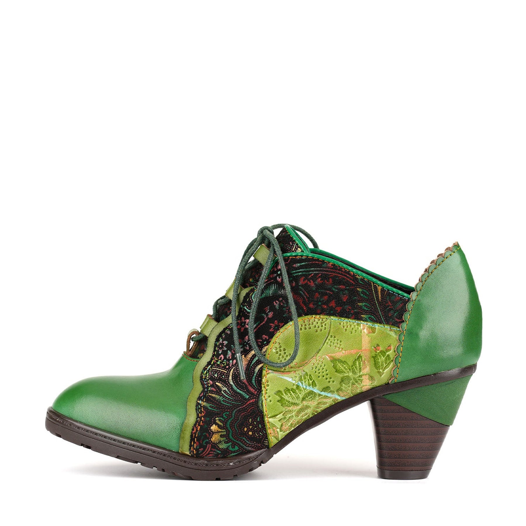 This elegant lace-up mid-heel shoe combines the beauty of nature and art, featuring vibrant genuine leather and colorful embroidered fabric for a unique vintage vibe. The sides are adorned with lace trim and botanical patterns, further highlighting the layered design and intricate craftsmanship.