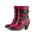 Available in deep midnight blue or bold crimson red, they are crafted with sleek cross straps and polished gold-tone buckles that create a striking contrast against the rich leather. A sturdy block heel ensures comfort and stability, making them the perfect choice for evening outings, creative gatherings, or chic everyday wear.