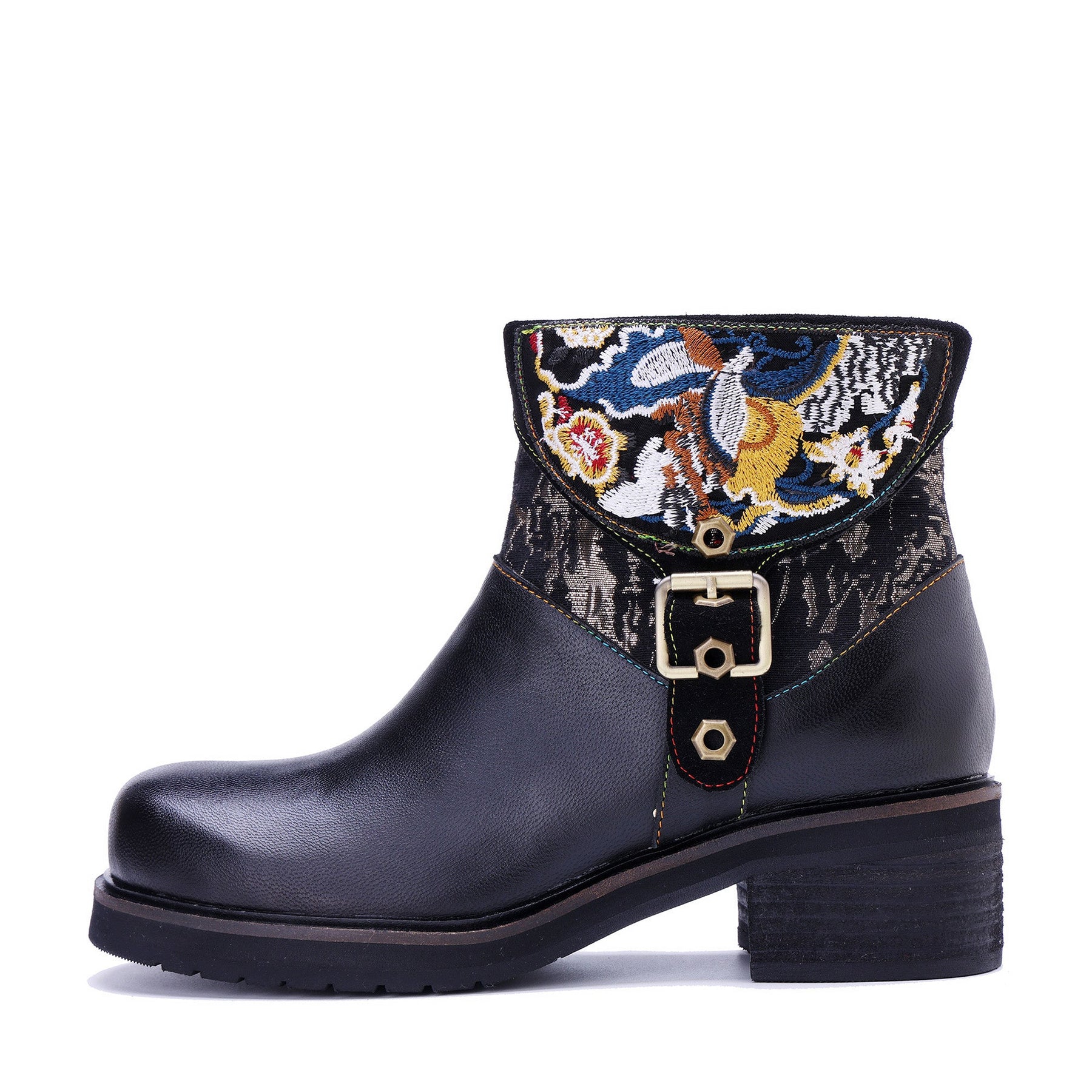 Essas botas do tornozelo são o epítome da elegância discreta, misturando couro preto clássico com bordados florais intrincados e detalhes de tecido texturizado. O manguito bordado acrescenta um toque de arte, enquanto o sotaque de fivela de tons de ouro aumenta o design elegante. Com um salto robusto de bloqueio baixo, essas botas são tão confortáveis quanto na moda. Perfeito para passeios casuais, reuniões formais ou adicionar um toque refinado ao seu guarda -roupa diário.